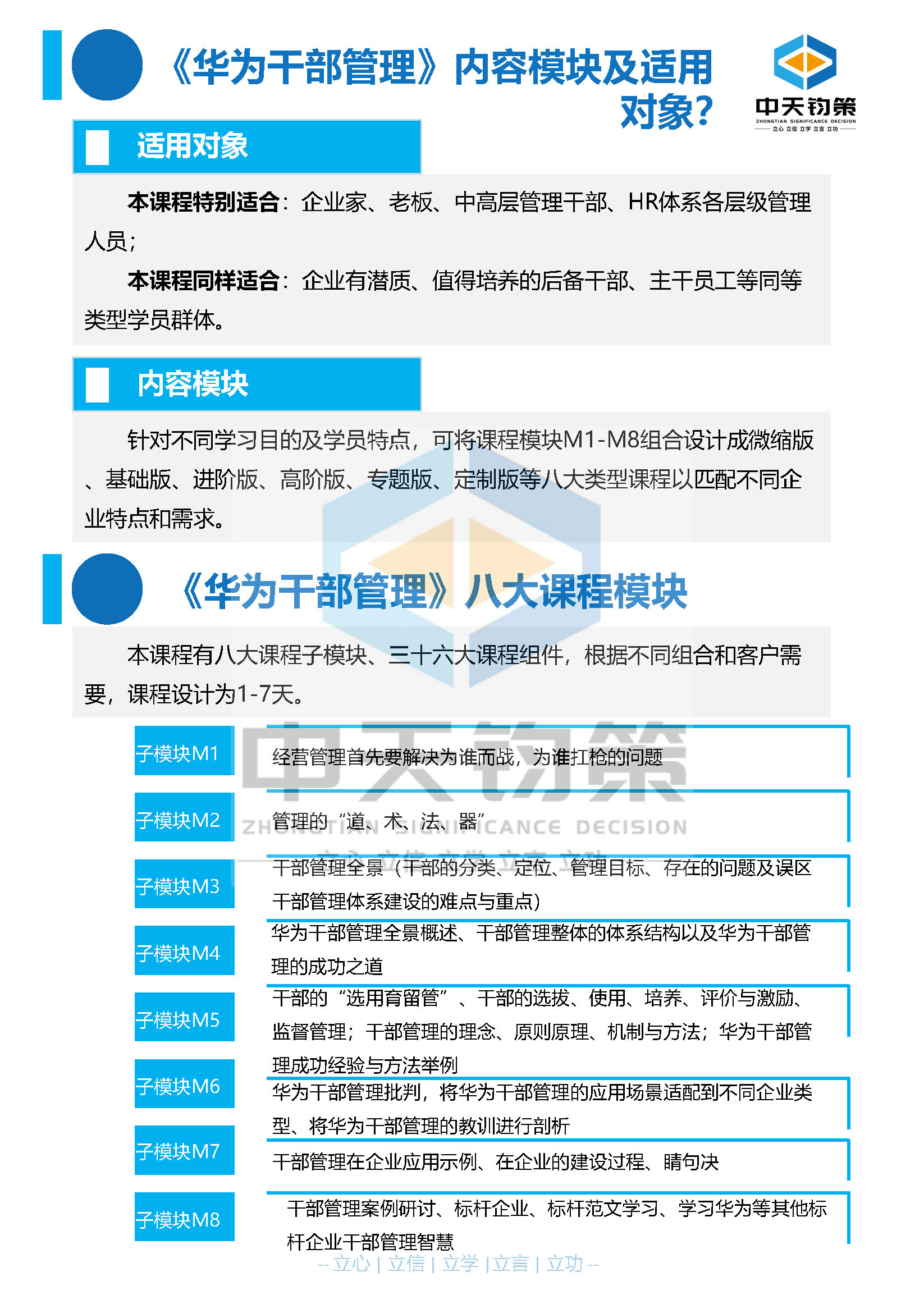 -本课程有八大课程子模块、三十六大课程组件,根据不同组合和客户需要,课程设计为1-7天。