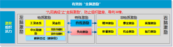 “全脑激励”管理是激励管理改进的目标和方向,要做到“有效激励”,则各个激励要素上都有效(“全脑激励”):有效的物质激励(包括工资,奖金,薪酬包,中长期激励TUP、ESOP、实股等),有效的精神激励,有效的荣誉激励,有效的事业激励,有效的机会激励,有效的氛围激励,有效的魅力激励,有效的自我激励,有效的负向激励这九种激励的“九阳真经”都发挥作用,即进行“全脑激励”。