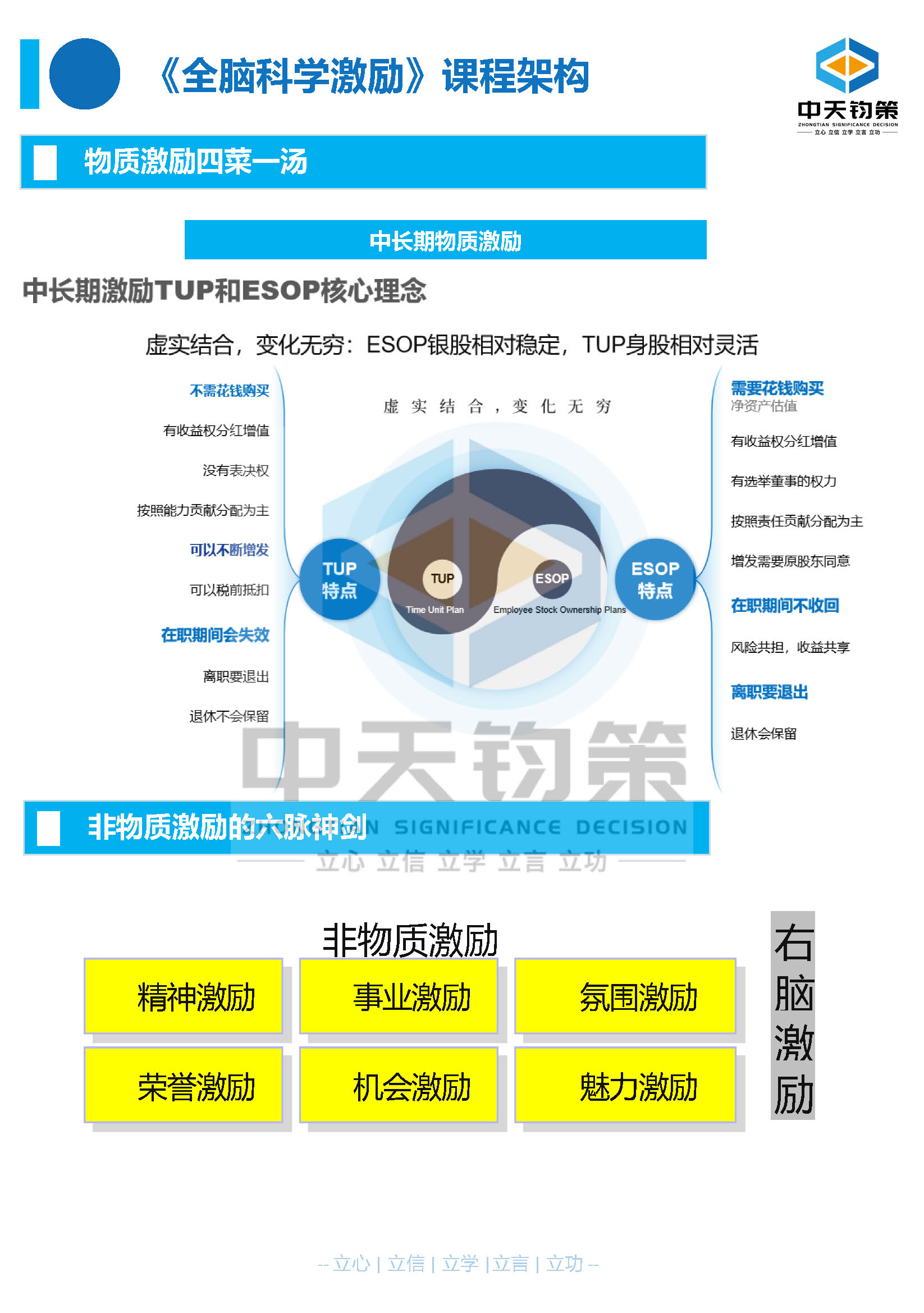 中长期激励包括ESOP虚拟股激励,TUP分时激励计划,实股激励等。其中ESOPTUP是基于华为股权激励实践做的特色股权激励方案。