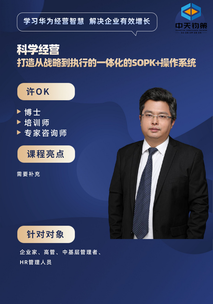 许OK博士知识博学,咨询、实战、授课经历丰富,广受好评。许博士既能贯穿理论体系,又能基于近二十年的企业CEO、VP、CIO、CHO等高层管理经验,授课具有高度的实战型,且能将标杆企业的最佳实践如华为等企业融入到授课中,不只是讲授,更是课堂实际训战;通过许博士娓娓道来,直达企业管理痛点,有思想,更有手法,懂业务,更懂企业家,懂企业管理实际的卡点、堵点、痛点。