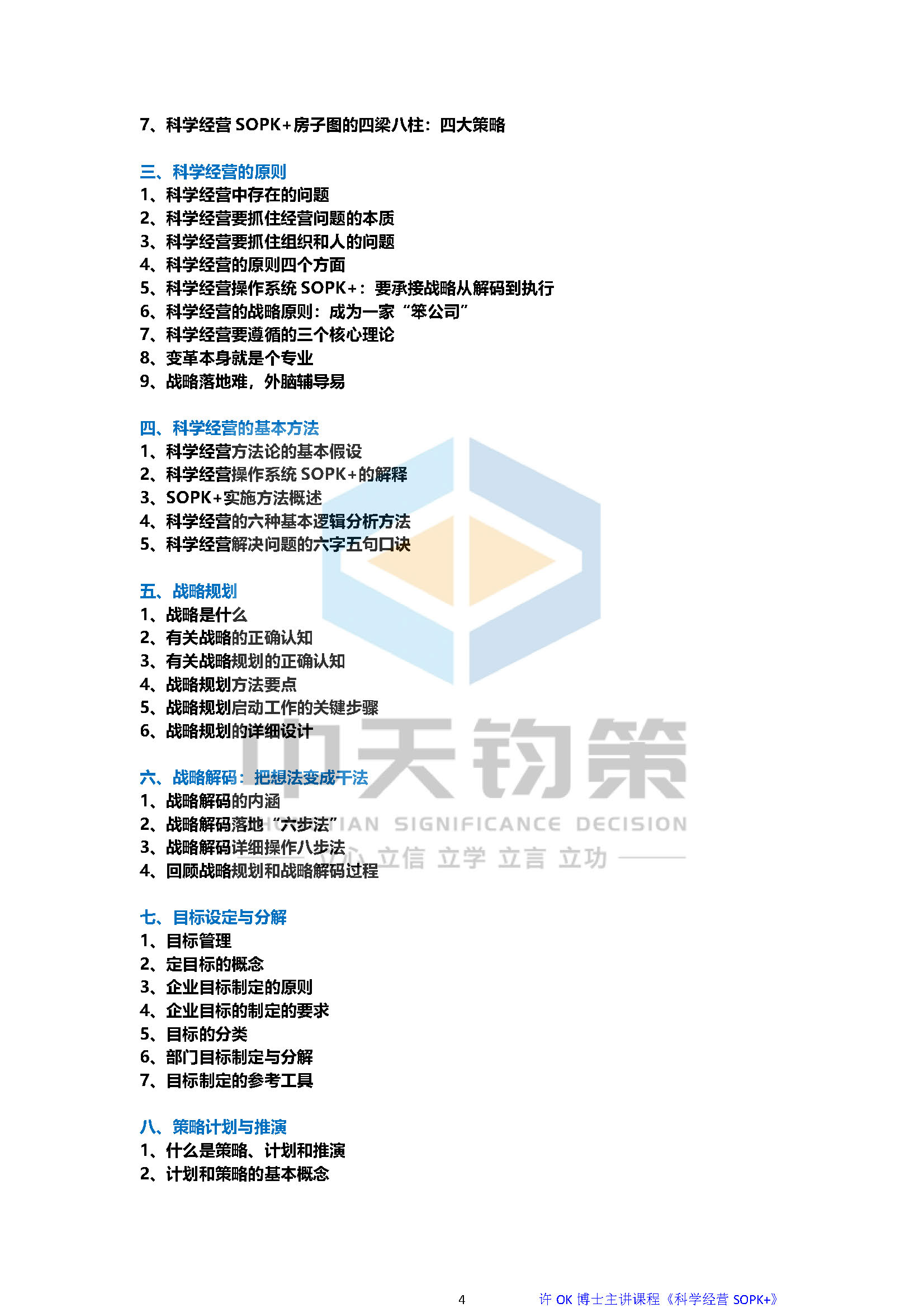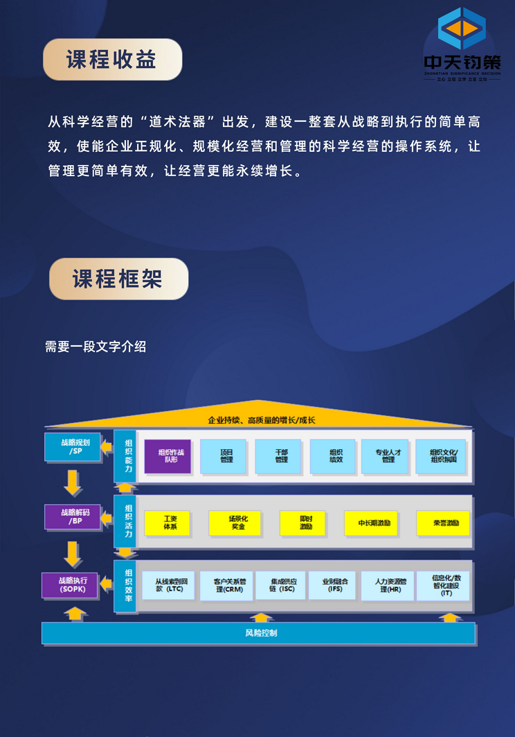 说明:本咨询模块有电子工业出版社《科学经营》一书作为咨询、授课的讲义之一;此外,由于本人是本书的主笔,所以本人有上百万字的手稿内容作为咨询、授课的原创资料。本部分呈现的内容仅为基本内容,每个企业情况不同,在调研后会进行定制化设计咨询、授课方案。