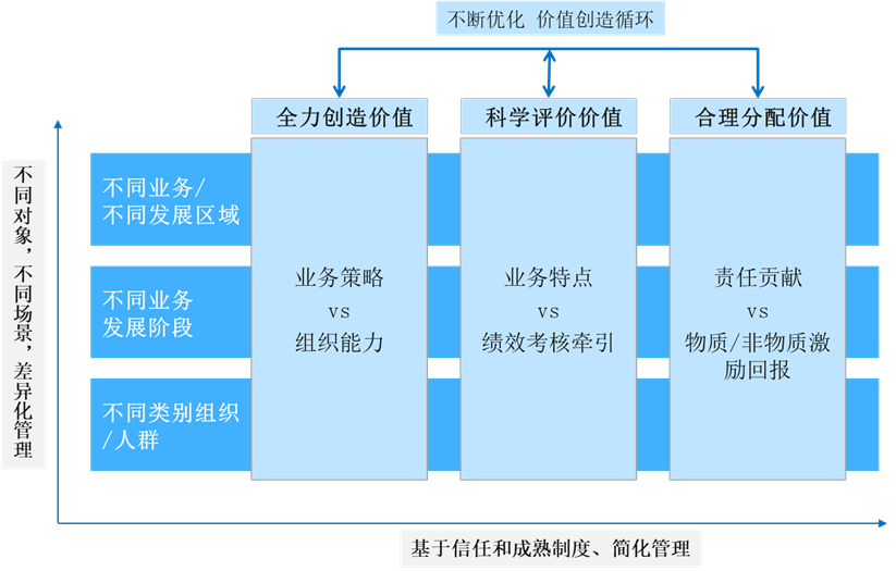 如图所示,企业的价值循环要针对不同对象,不同场景,进行差异化管理,并在成熟制度基础上,基于信任进行简化管理,以全力创造价值、科学评价价值、合理分配价值。科学评价价值的核心是绩效评价,企业要依据业务特点进行评价,并且依据责任贡献对物质和非物质激励资源进行合理分配,以最大化驱动企业员工全力创造价值。